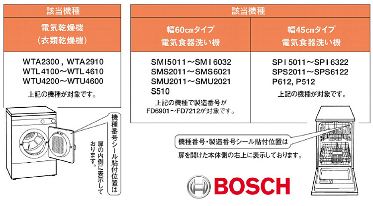 幅60cmタイプ 電気食器洗い機 SMI5011~SMI6032 SMS2011~SMS6021 SMU2011~SMU2021 S510 上記の機種で製造番号がFD6901~FD7212が対象です。 |
